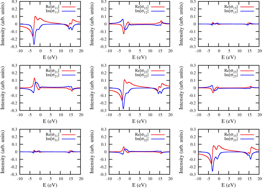 In principle one can calculate the spectra for any magnetic field direction, but also for any polarization direction. The Poyinting vector must not be in the $z$ direction and there are thus infinite possibilities to define left circular polarized light. In optics this is solved by calculating the optical conductivity tensor. This is a three by three matrix that describes the optical properties of the material for any posible polarization. If $\sigma(\omega)$ is the energy dependent conductivity tensor (three by three matrix) and $\varepsilon$ the polarization (a vector of length three) then the absorption is give as: $I_{XAS} = -\mathrm{Im}[\varepsilon^* \cdot \sigma(\omega) \cdot \varepsilon$]. The conductivity tensor for Ni$^{2+}$ with a field in the $(102)$ direction is shown in the figure above.