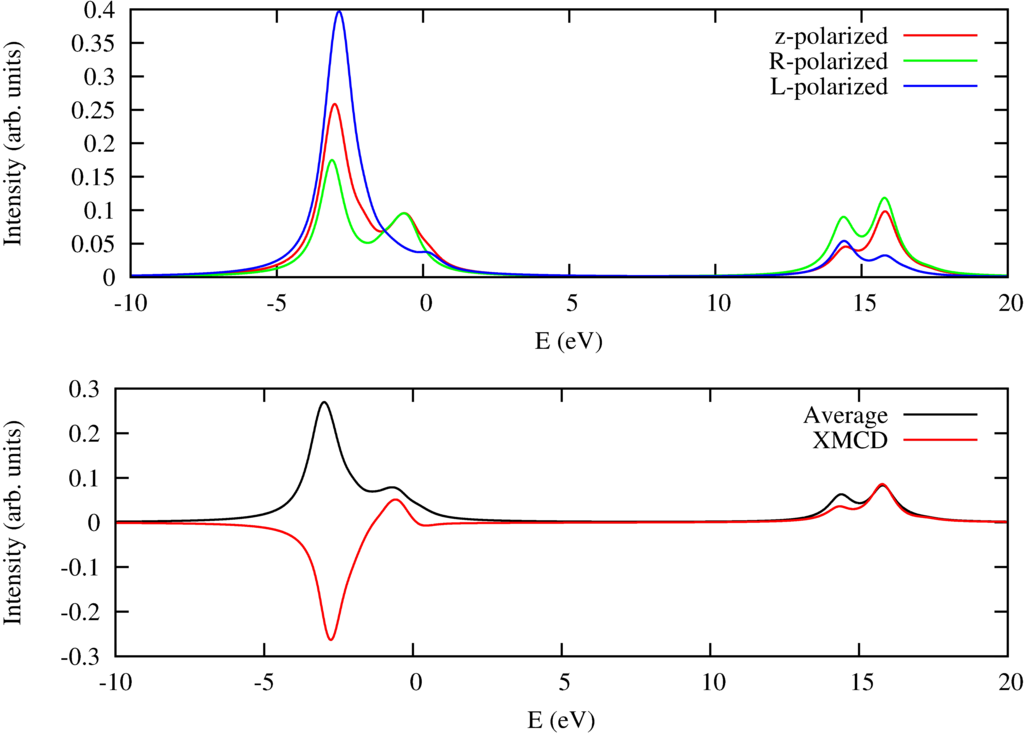 Besides some text this program also creates plots of the x-ray absorption spectra. In the configuration file the magnetic field is set in the $(102)$ direction. The temperature is $1$ Kelvin and as the field size in the $z$ direction is 10 Tesla the Ni ion will be fully magnetically polarized. One can calculate the magnetic circular dichroic spectra by calculating the spectra for left and right circular polarized light and calculating the difference. This is done in this example and in the figure above one can see in the top pannel the XAS for $z$, $R$ (right circular) and $L$ (left circular) polarized light. The bottom pannel shows the isotropic spectra and the magnetic circular dichroic spectrum.